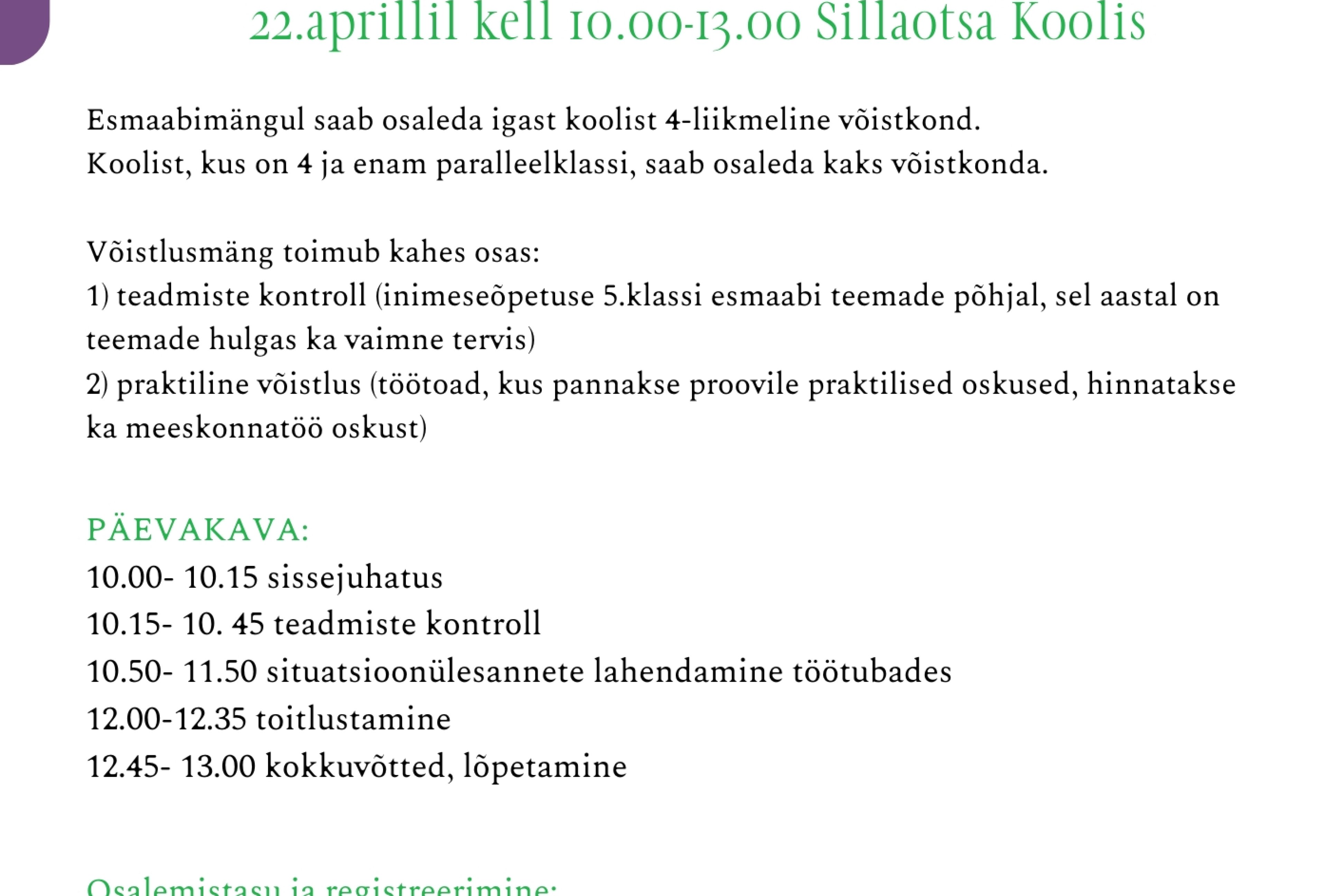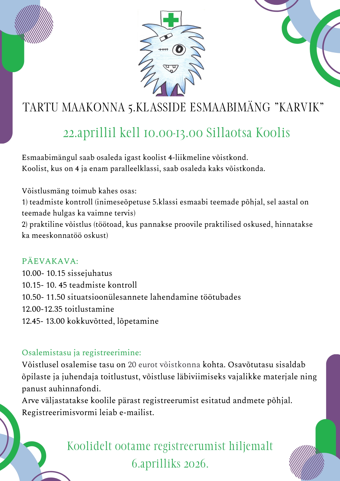 Kutsume Tartu maakonna 5. klasside õpilasi panema proovile oma teadmised ja oskused esmaabimängul "Karvik", mis toimub 22. aprillil kell 10.00–13.00 Sillaotsa Koolis.